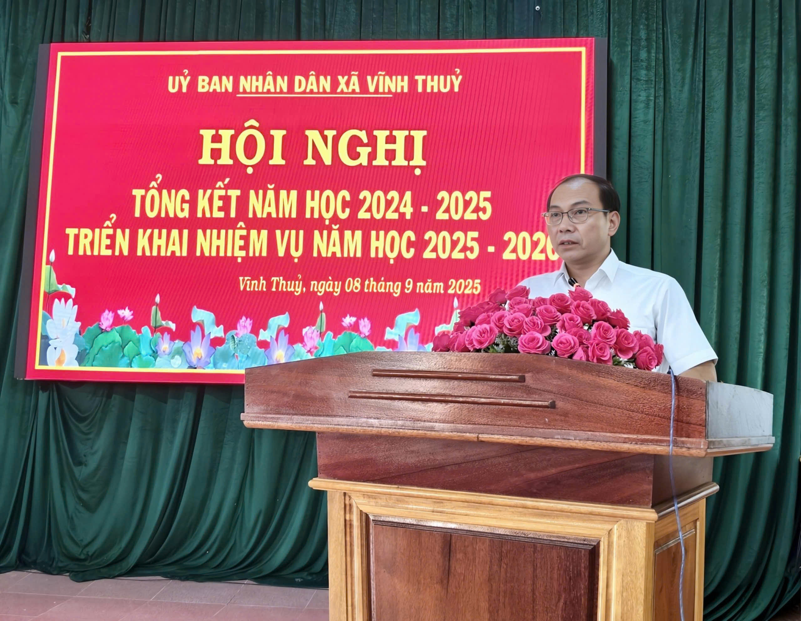 Phát biểu chỉ đạo tại hội nghị, đồng chí Lê Thanh Hải - PBT Thường trực Đảng ủy xã ghi nhận, biểu dương những nỗ lực, thành tích mà ngành giáo dục xã Vĩnh Thủy đã đạt được trong năm học qua, đồng thời kêu gọi toàn thể cán bộ, giáo viên, học sinh tiếp tục phát huy tinh thần trách nhiệm, đoàn kết, sáng tạo, quyết tâm thực hiện thắng lợi nhiệm vụ năm học mới 2025-2026.