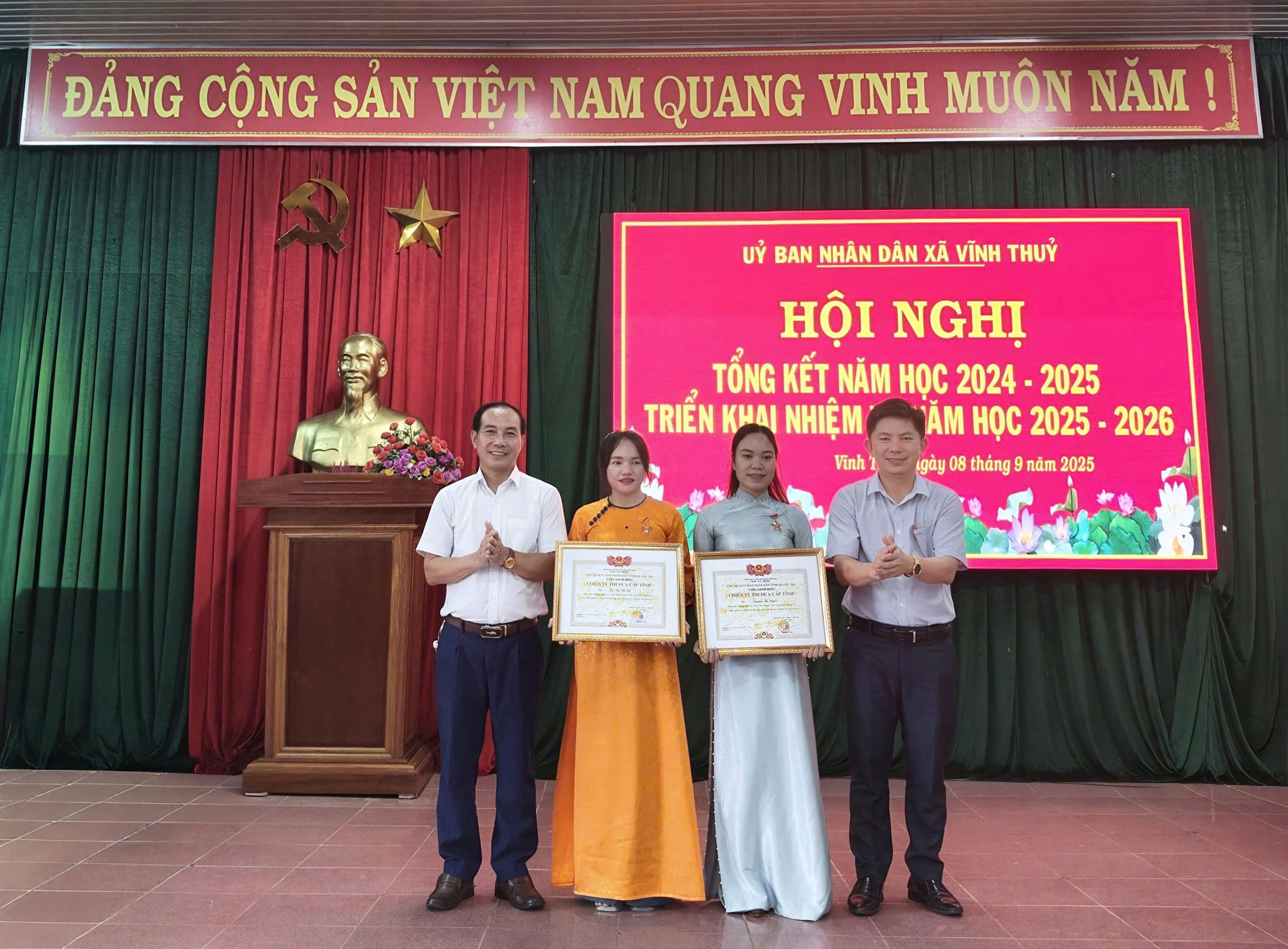 Trong năm học 2024-2025, ngành giáo dục xã Vĩnh Thủy đã đạt được nhiều kết quả quan trọng: chất lượng dạy và học ngày càng được nâng cao, cơ sở vật chất trường lớp tiếp tục được quan tâm đầu tư; phong trào thi đua dạy tốt – học tốt, xây dựng trường học thân thiện, học sinh tích cực được triển khai hiệu quả. Nhiều em học sinh đạt thành tích cao trong học tập, rèn luyện, góp phần vào thành tích chung của giáo dục xã nhà.