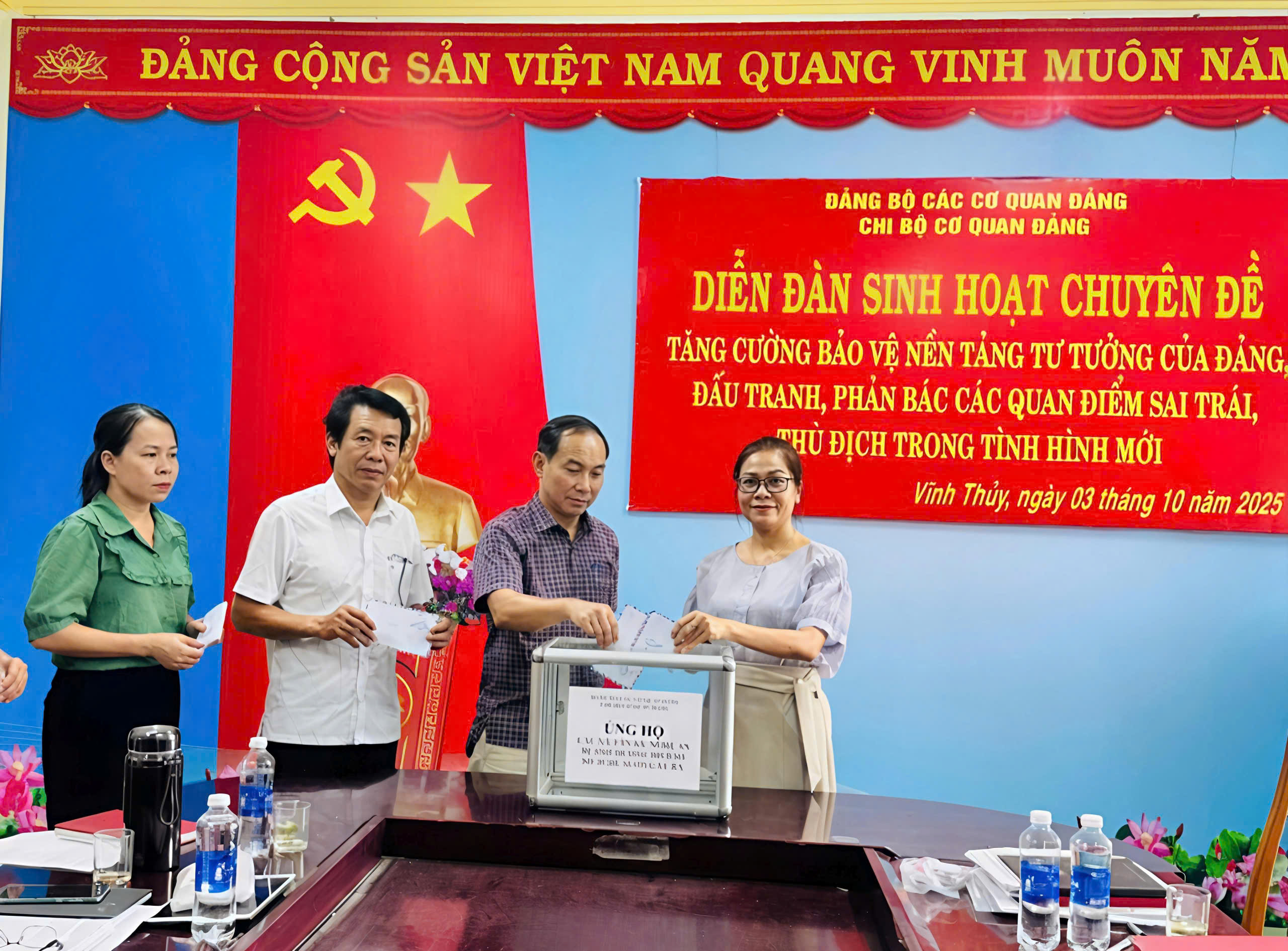 Ngay sau kết thúc diễn đàn sinh hoạt chi bộ cán bộ, đảng viên Chi bộ Cơ quan Đảng xã đã tiến hành quyên góp ủng hộ đồng bào các xã kết nghĩa ở huyện Tân Kỳ (cũ), tỉnh Nghệ An bị ảnh hưởng cơn bão số 10 (BUALOI) do Ủy ban Mặt trận Tổ quốc Việt Nam xã Vĩnh Thủy tổ chức phát động với số tiền 3.500.000đ, để cùng với xã chia sẻ đến Nhân dân các xã kết nghĩa vượt qua khó khăn, sớm ổn định cuộc sống.