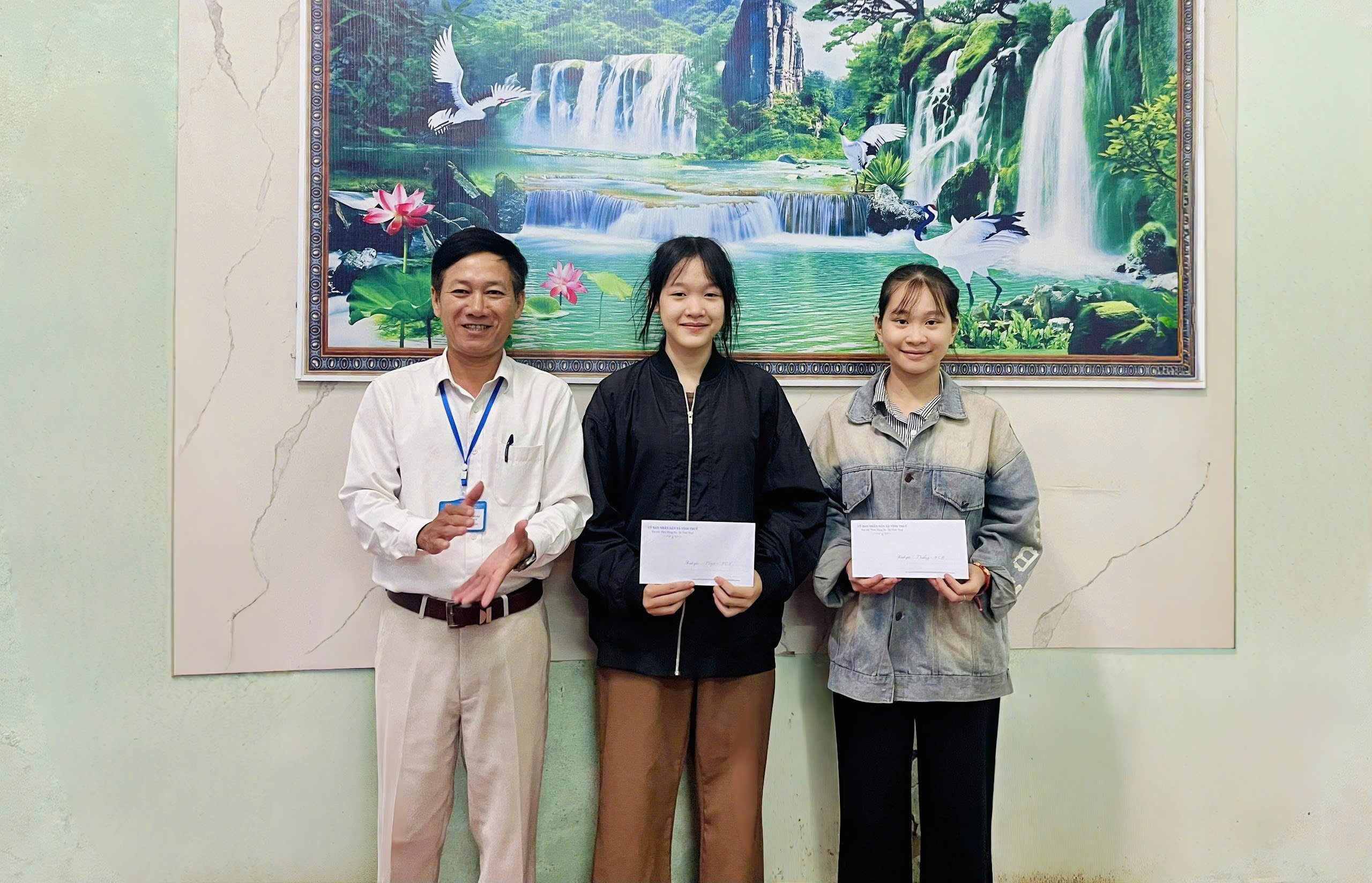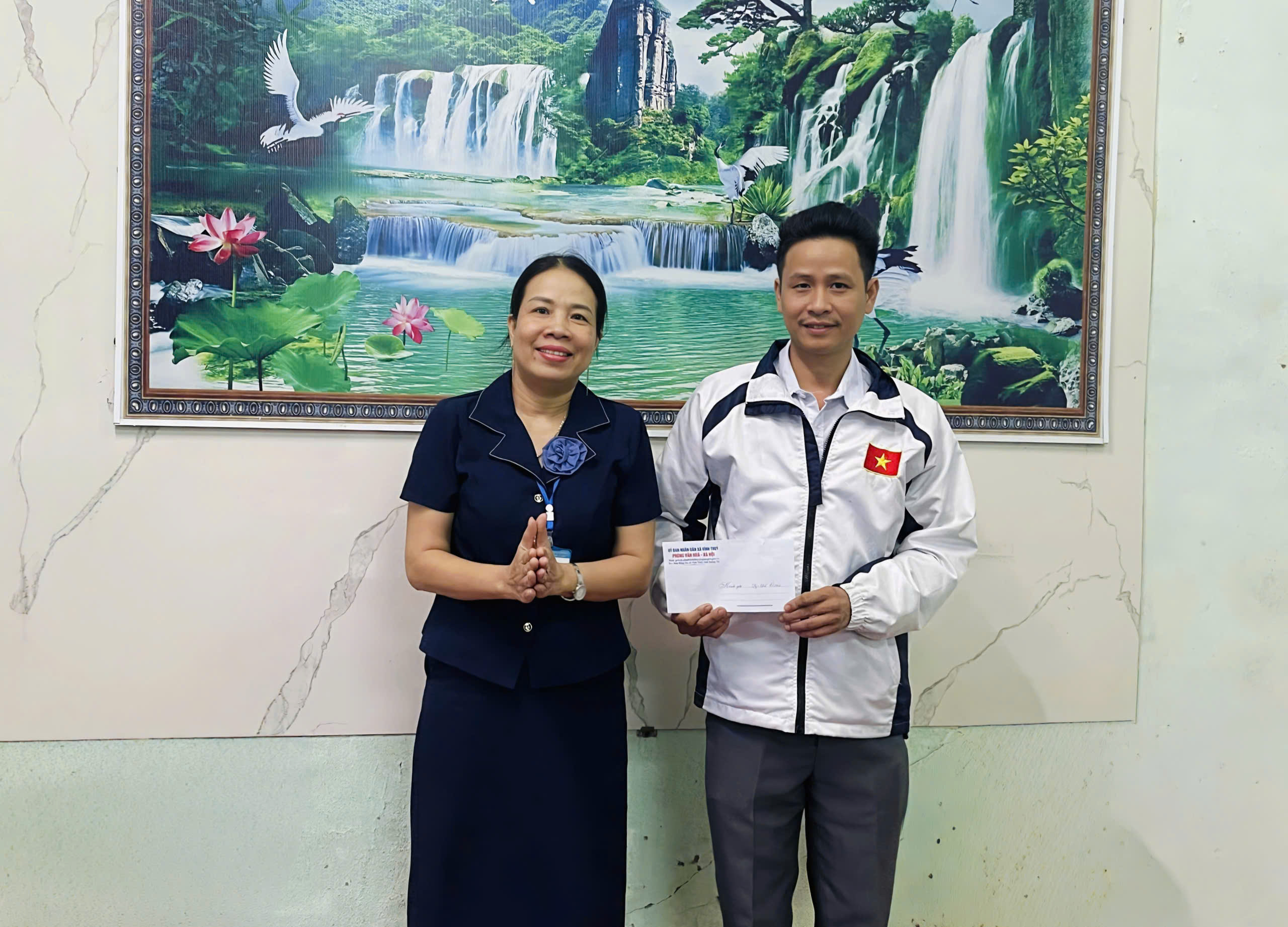 Đồng chí Võ Duy Hoài - ĐUV, Phó Chủ tịch UBND xã thưởng nóng cho 2 vận động viên đạt huy chương