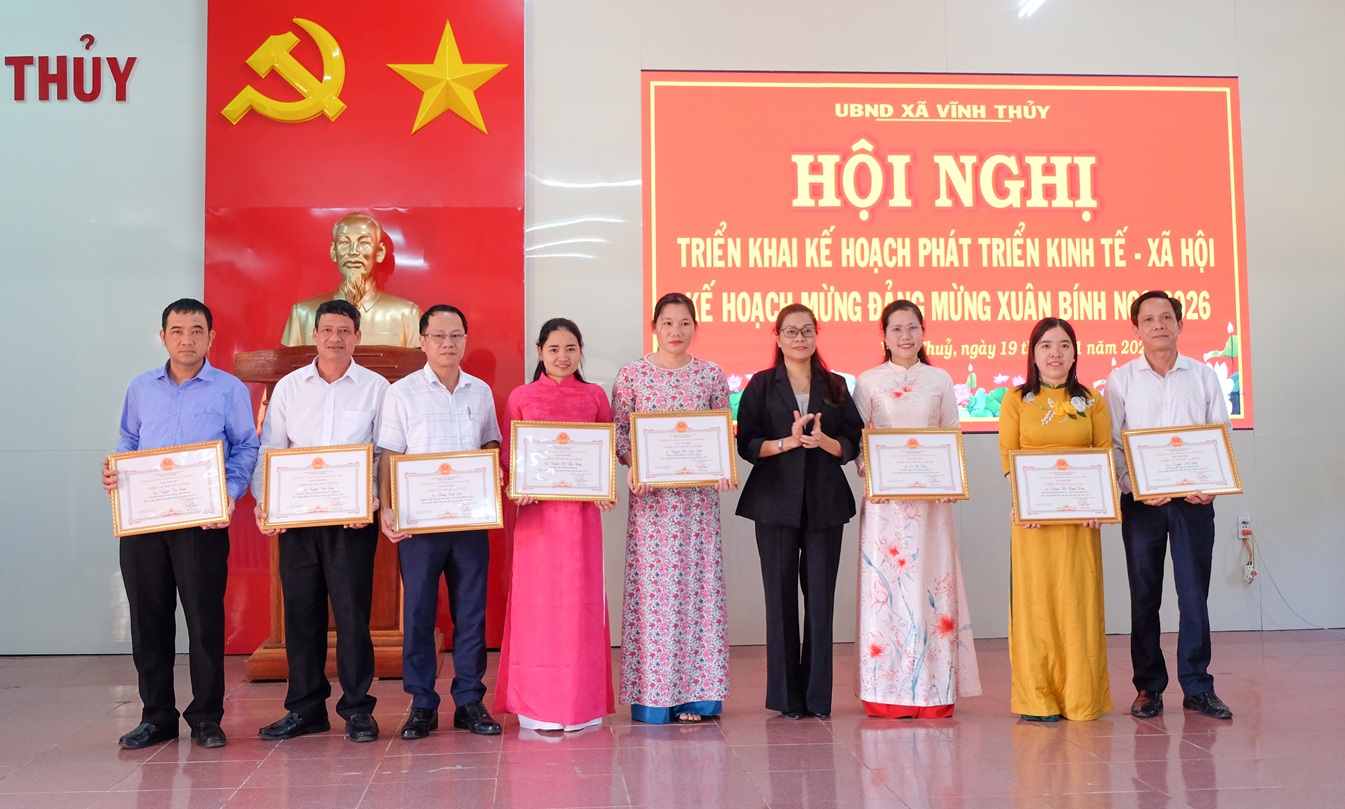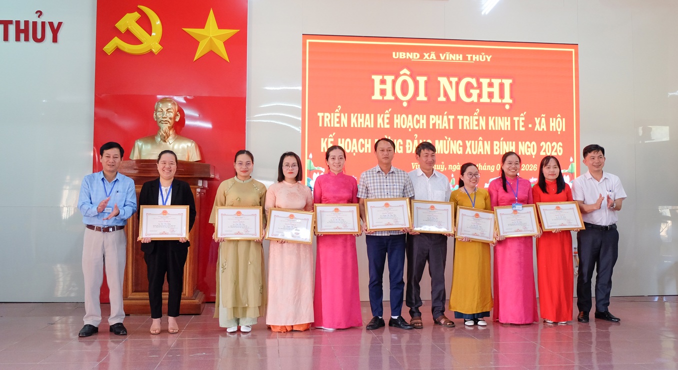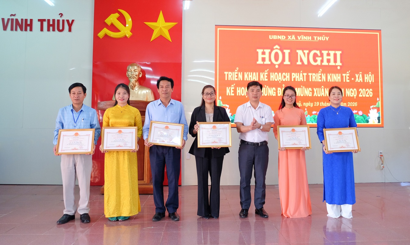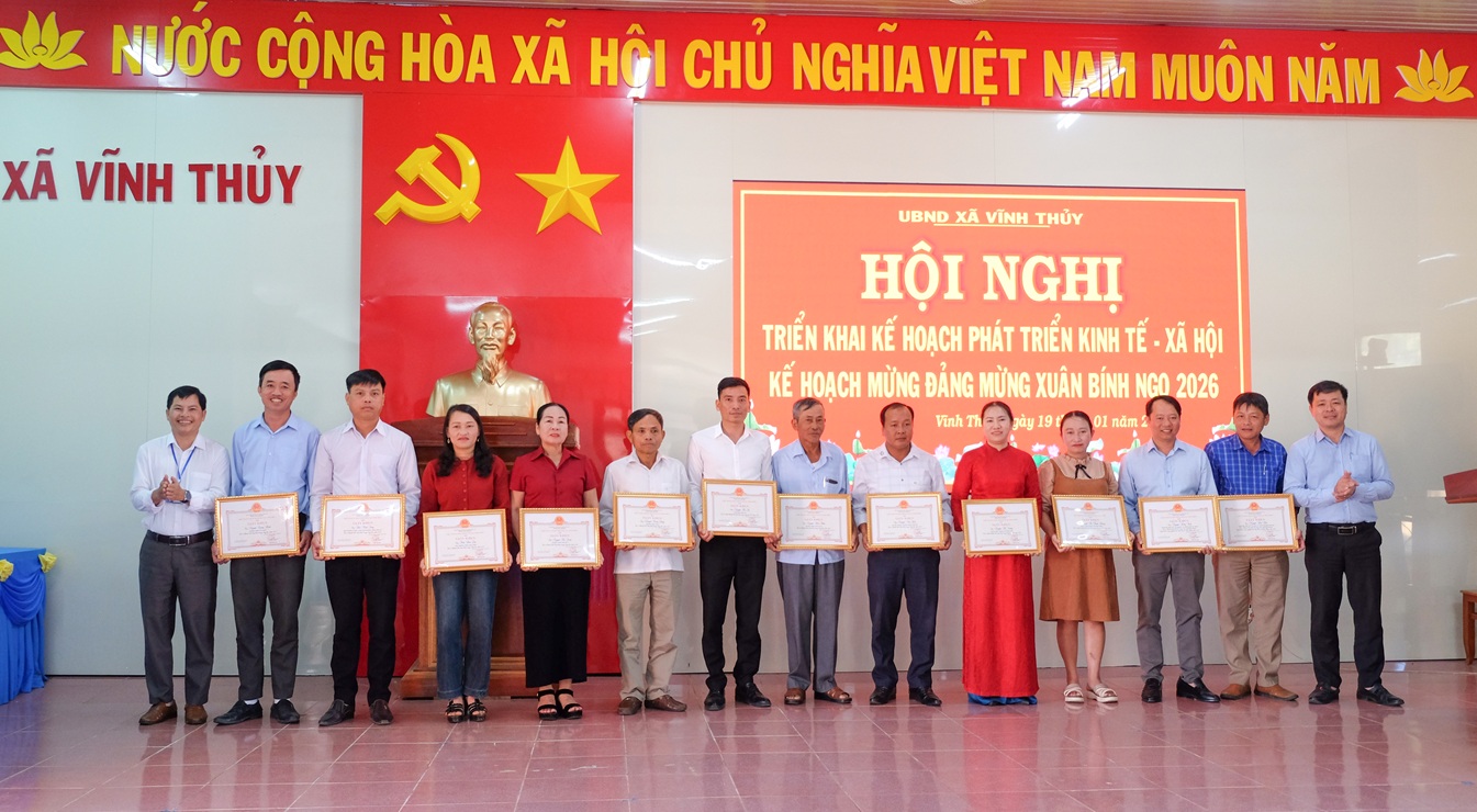 Chiều 19/1/2026, UBND xã Vĩnh Thuỷ tổ chức hội nghị triển khai nhiệm vụ phát triển kinh tế- xã hội năm 2026; Chương trình công tác trọng tâm năm 2026, Kế hoạch tổ chức các hoạt động mừng Đảng- mừng Xuân Bính Ngọ; Kế hoạch thu các loại quỹ năm 2026 và tổng kết công tác thi đua, khen thưởng năm 2025, phương hướng, nhiệm vụ năm 2026.