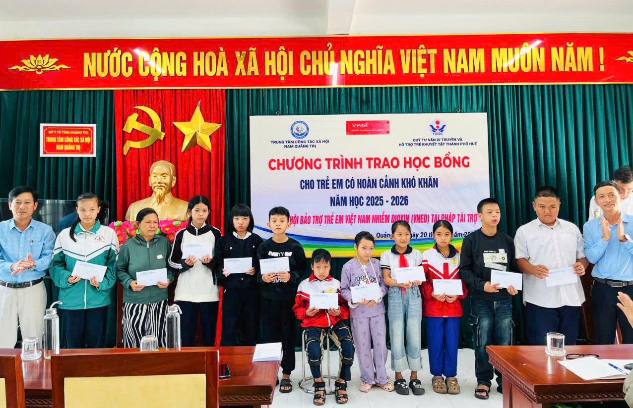 Ngày 20/3/2026, tại Trung tâm Công tác xã hội Nam Quảng Trị, Quỹ Tư vấn di truyền và hỗ trợ trẻ khuyết tật thành phố Huế phối hợp với Trung tâm Công tác xã hội Nam Quảng Trị tổ chức chương trình trao học bổng cho trẻ em có hoàn cảnh khó khăn năm học 2025- 2026. Chương trình do Hội Bảo trợ trẻ em nhiễm Dioxin Việt Nam (VNED) tại Pháp tài trợ, nhằm tiếp thêm động lực cho các em vượt qua khó khăn, vươn lên trong học tập và cuộc sống.