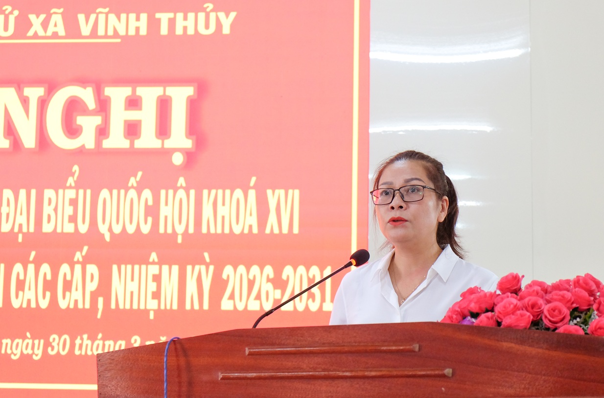 Ngày 30/3/2026, xã Vĩnh Thủy tổ chức hội nghị tổng kết công tác bầu cử đại biểu Quốc hội khóa XVI và đại biểu HĐND các cấp, nhiệm kỳ 2026- 2031. Dự hội nghị có các đồng chí: Nguyễn Thị Thu Hà- Bí thư Đảng ủy, Chủ tịch HĐND xã; Lê Thanh Hải- Phó Bí thư Thường trực Đảng ủy; Thái Nam Sơn- Chủ tịch UBND xã; Lương Ngọc Ninh- Chủ tịch UBMTTQVN xã; các đồng chí trong Ban Thường vụ Đảng ủy, cùng đại diện lãnh đạo các ban HĐND xã; lãnh đạo UBND xã; các bộ phận chuyên môn; Ban Thường trực Ủy ban MTTQ Việt Nam xã; các tổ chức chính trị - xã hội; lực lượng Công an, Ban Chỉ huy Quân sự xã; lãnh đạo các đơn vị trực thuộc; Tổ trưởng các tổ bầu cử, trưởng thôn.