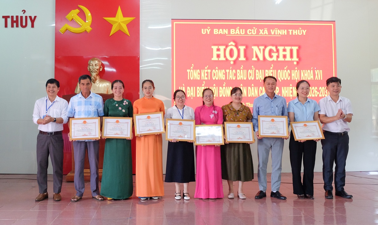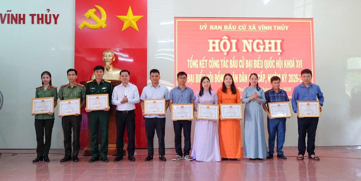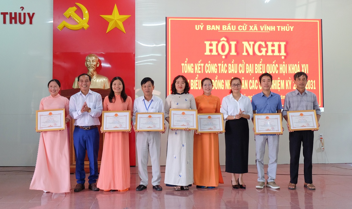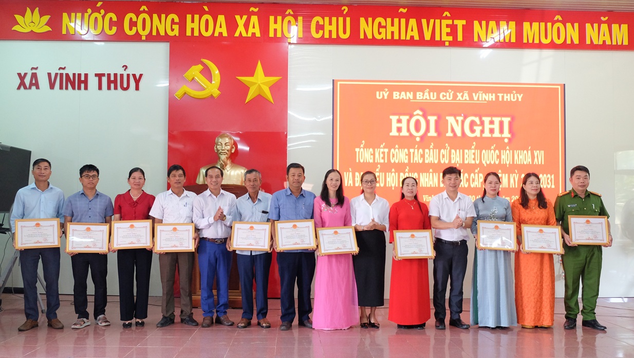 Nhân dịp này, UBND xã Vĩnh Thủy đã biểu dương, khen thưởng 11 tập thể và 25 cá nhân có thành tích xuất sắc trong công tác bầu cử, góp phần quan trọng vào thành công chung của cuộc bầu cử trên địa bàn. Ghi nhận những kết quả nổi bật đó, xã Vĩnh Thủy cũng vinh dự được UBND tỉnh tặng Bằng khen vì đã có thành tích xuất sắc trong công tác tổ chức bầu cử.