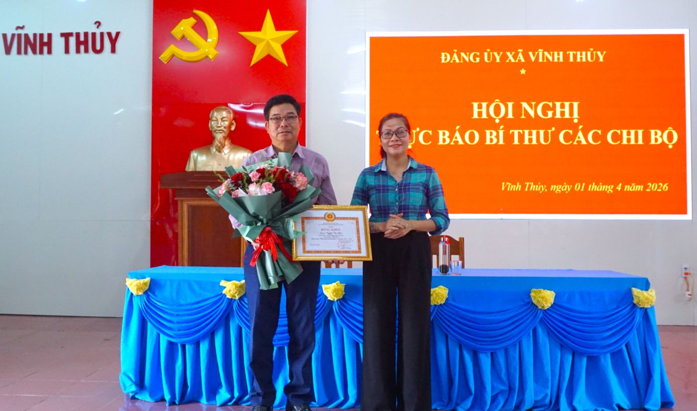 Ngày 1/4/2026, Đảng ủy xã Vĩnh Thủy tổ chức Hội nghị trực báo Bí thư các chi bộ tháng 4 năm 2026 nhằm đánh giá tình hình thực hiện nhiệm vụ tháng 3 và triển khai phương hướng, nhiệm vụ trọng tâm trong thời gian tới. Đồng chí Nguyễn Thị Thu Hà – Bí thư Đảng uỷ xã chủ trì hội nghị.