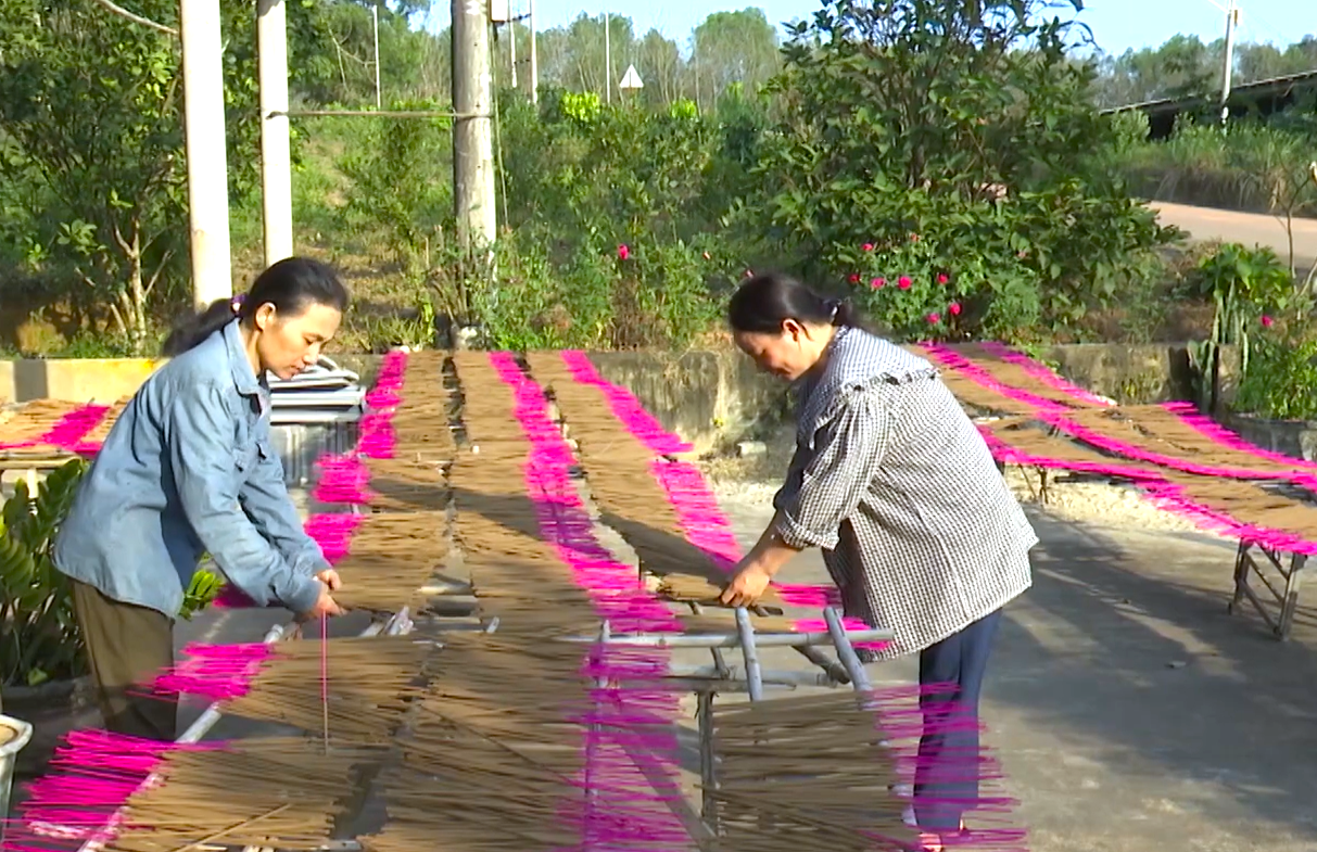 Bên cạnh đó, xu hướng kinh tế xanh cũng được thể hiện rõ nét qua sản phẩm Hương thảo mộc VT của chị Đoàn Thị Vân ở thôn Tân Thuỷ. Đây là kết quả của việc khai thác nguồn tài nguyên bản địa như rễ hương bài, trầm hương, quế và bời lời để tạo ra sản phẩm an toàn cho sức khỏe. Điểm đáng chú ý là sự kết hợp giữa tinh hoa truyền thống và máy móc hiện đại (máy trộn bột, máy làm hương) giúp giảm sức lao động và ổn định chất lượng. Với chứng nhận OCOP 3 sao, sản phẩm hương thảo mộc VT không chỉ mang về nguồn thu trên 100 triệu đồng mỗi năm cho hộ sản xuất mà còn mở ra hướng đi triển vọng trong việc cung ứng các sản phẩm tiêu dùng thân thiện với môi trường ra thị trường toàn quốc.