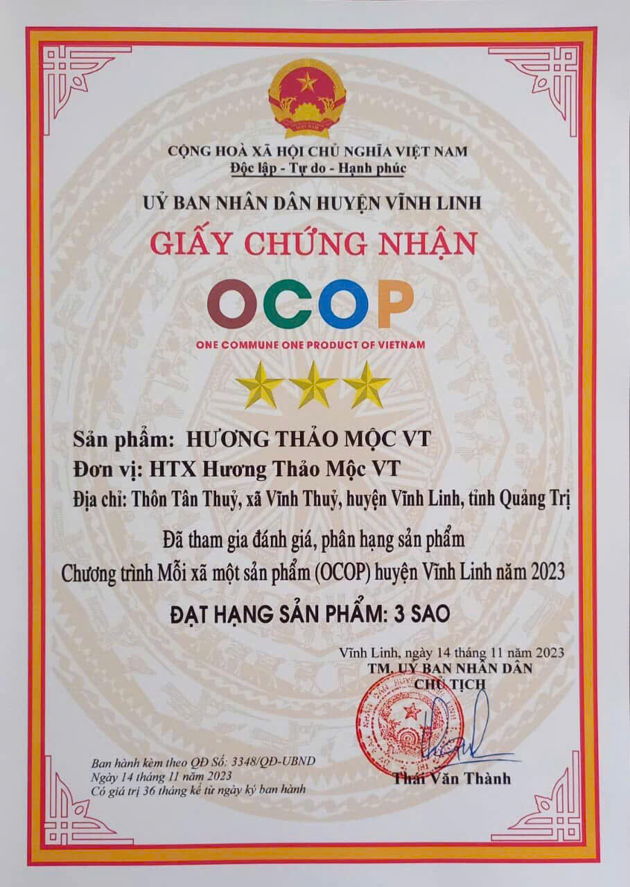 Sản phẩm Hương Thảo Mộc Vĩnh Thủy thể hiện sự trân trọng và tinh thần gìn giữ nét đẹp văn hóa truyền thống của người Việt, đã được công nhận là sản phẩm OCOP 3 sao, khẳng định chất lượng và giá trị vượt trội. Đây là thành quả của sự nỗ lực không ngừng nghỉ của Hợp tác xã tổng hợp Hương Thảo Mộc Vĩnh Thủy, cùng với sự hỗ trợ tích cực từ chính quyền địa phương trong việc quảng bá, xúc tiến thương mại.
