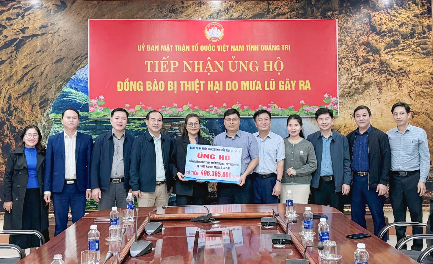 Chiều 16/12/2025, đoàn lãnh đạo xã Vĩnh Thủy đã trao số tiền gần 500 triệu đồng ủng hộ đồng bào miền Trung và Tây Nguyên bị thiệt hại do mưa lũ cho Ủy ban MTTQ Việt Nam tỉnh Quảng Trị.