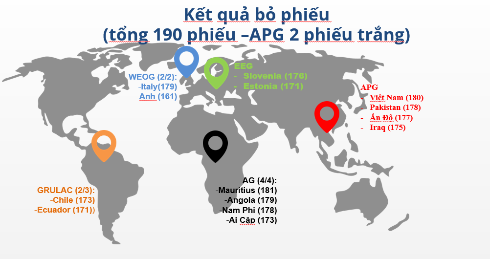Theo thông tin từ Bộ Ngoại giao, cuộc họp Đại hội đồng ngày 14/10 với sự tham dự của 190 quốc gia thành viên LHQ đủ tư cách bỏ phiếu đã bầu 14 nước thành viên Hội đồng Nhân quyền LHQ nhiệm kỳ 2026-2028 gồm: Việt Nam, Ấn Độ, Pakistan, Iraq, Ai Cập, Nam Phi, Mauritius, Angola, Estonia, Slovenia, Chile, Ecuador, Italy và Anh. Việt Nam đạt 180 phiếu ủng hộ, cao nhất trong nhóm châu Á – Thái Bình Dương; đồng thời là nước châu Á – Thái Bình Dương duy nhất là thành viên Hội đồng Nhân quyền LHQ nhiệm kỳ 2023-2025 tái đắc cử nhiệm kỳ 2026-2028.