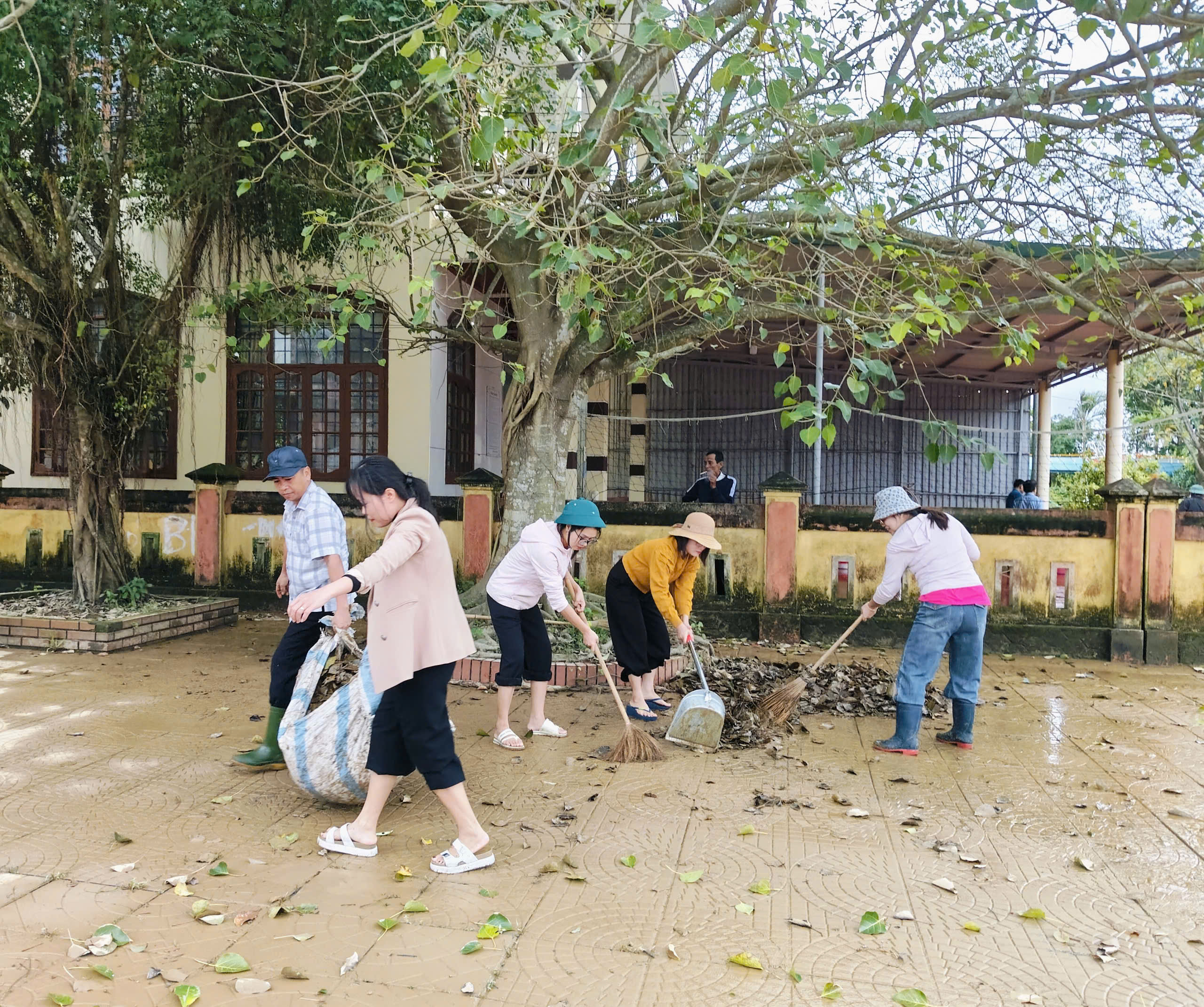Cán bộ, công chức HĐND, UBND xã Vĩnh Thủy khắc phục hậu quả sau lụt