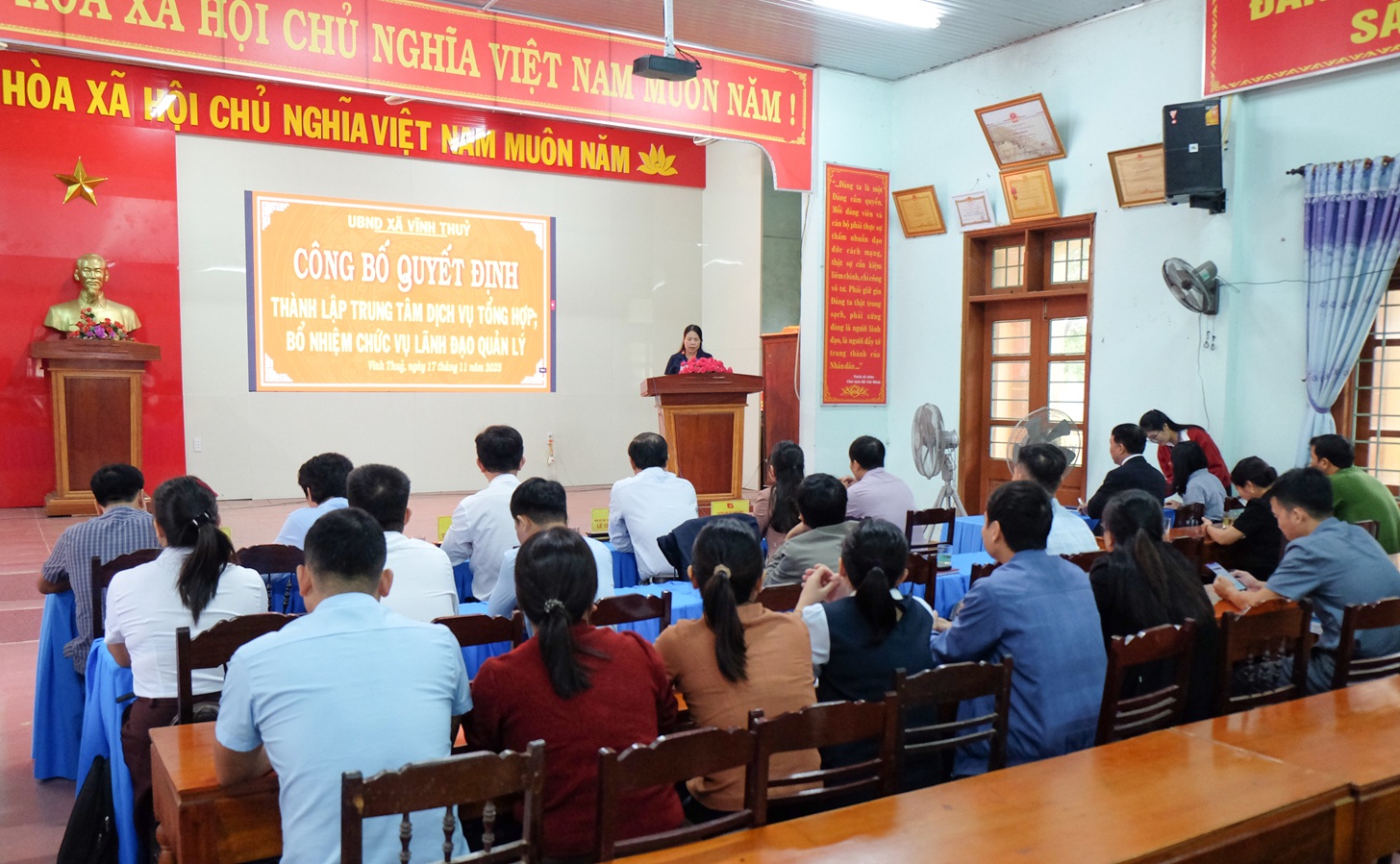 Tại buổi lễ, UBND xã đã công bố Quyết định thành lập Trung tâm Dịch vụ tổng hợp xã Vĩnh Thuỷ. Theo đó, Trung tâm là đơn vị sự nghiệp công lập, thực hiện chức năng cung ứng các dịch vụ cơ bản, thiết yếu cho nhân dân trên địa bàn, gồm các lĩnh vực: văn hoá, thông tin, truyền thông, thể thao và du lịch, khuyến nông, môi trường và các dịch vụ khác theo nhu cầu thực tiễn. Trung tâm có tư cách pháp nhân, con dấu, tài khoản và kinh phí hoạt động riêng theo quy định của pháp luật.
