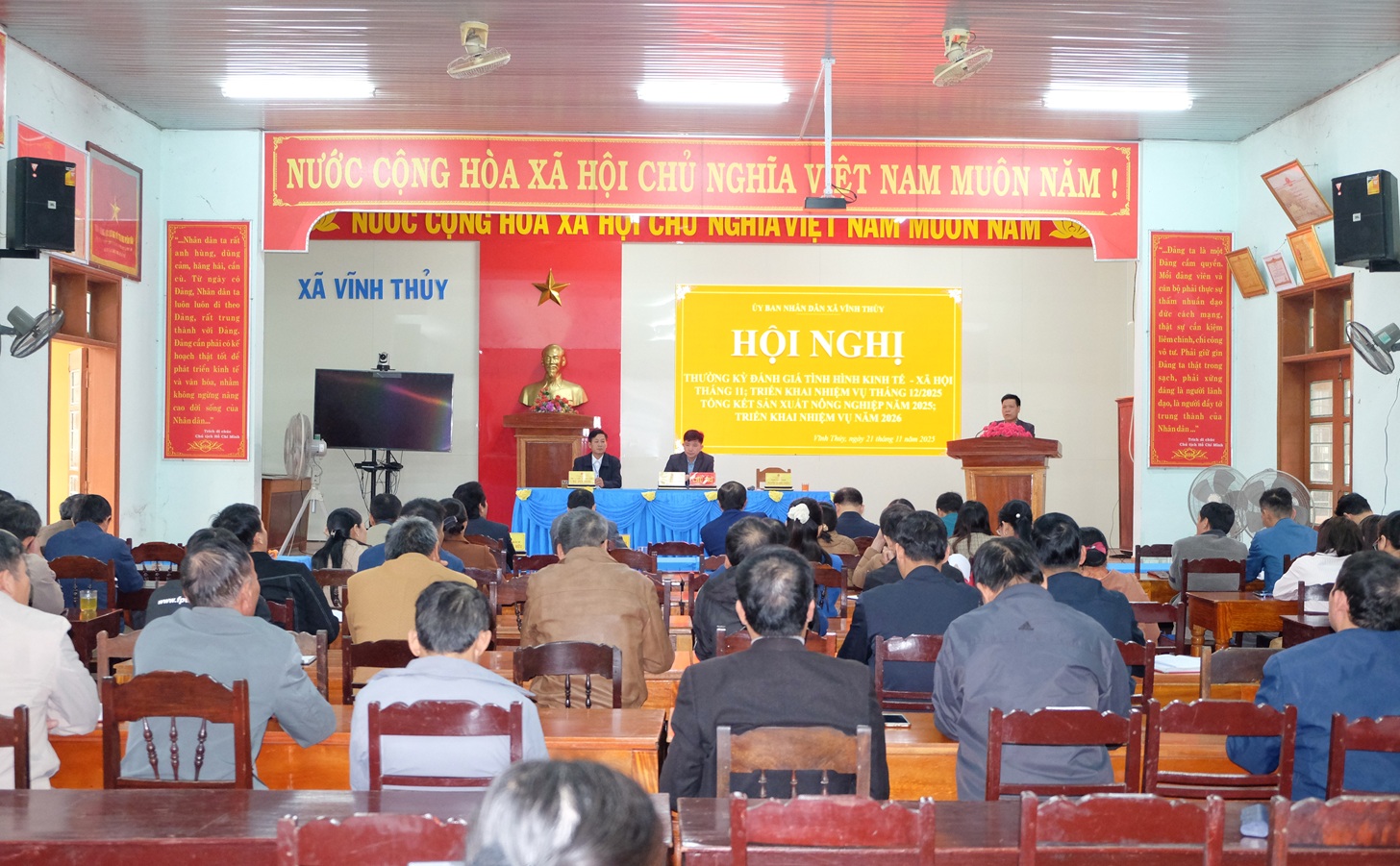 Chiều 21/11/2025, UBND xã Vĩnh Thuỷ tổ chức hội nghị triển khai sản xuất nông nghiệp vụ Đông Xuân 2025 - 2026. Tham dự có các đồng chí: Lê Thanh Hải- Phó Bí thư Thường trực Đảng uỷ xã; Lương Ngọc Ninh- Chủ tịch UBMTTQVN xã, cùng các đồng chí trong Ban Thường vụ Đảng uỷ.