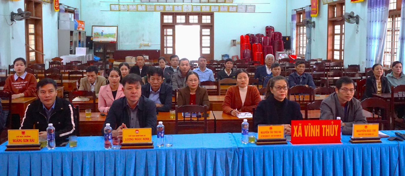 Tại điểm cầu xã Vĩnh Thủy, hội nghị có sự tham gia của các đồng chí: Nguyễn Thị Thu Hà – Bí Thư Đảng uỷ, Chủ tịch HĐND xã; Nguyễn Đức Trí – Phó Chủ tịch HĐND xã; Lương Ngọc Ninh – Chủ tịch UBMTTQ Việt Nam xã cùng các đồng chí trong thường trực Đảng ủy, HĐND, UBND, Ủy ban MTTQ Việt Nam xã; đại diện các ban, ngành, đoàn thể; bí thư chi bộ, trưởng thôn, trưởng ban công tác Mặt trận và đông đảo cử tri đại diện các tầng lớp Nhân dân trên địa bàn xã.