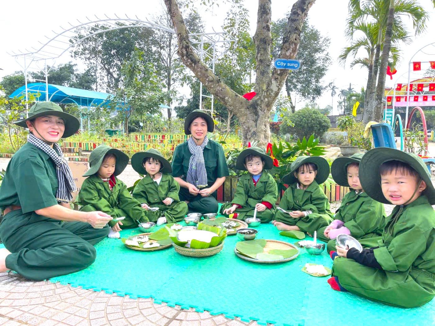 Không kém phần rộn ràng, trường Mầm non Vĩnh Lâm cũng đã tạo sân chơi bổ ích cho trẻ qua hoạt động trải nghiệm "Bé tập làm chú bộ đội". Các bé không chỉ được làm quen với cuộc sống quân ngũ thông qua các trò chơi mô phỏng mà còn tham gia biểu diễn văn nghệ, hát múa các bài hát về chú bộ đội, Bác Hồ và tình yêu quê hương đất nước. Những hoạt động này góp phần hình thành nhân cách và tình yêu đối với lực lượng vũ trang cho các em từ lứa tuổi mầm non.