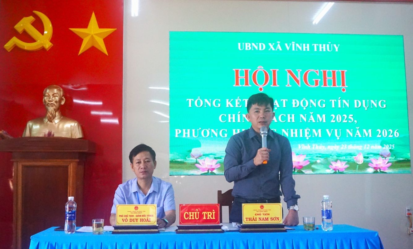 Hôm nay 23/12/2025, UBND xã Vĩnh Thủy tổ chức hội nghị tổng kết hoạt động tín dụng chính sách năm 2025 và triển khai phương hướng nhiệm vụ năm 2026. Tham dự có đồng chí Lê Thanh Hải – Phó Bí thư thường trực Đảng uỷ xã, Thái Nam Sơn – Chủ tịch UBND xã, Lương Ngọc Ninh – Chủ tịch UBMTTQ Việt Nam xã, Võ Duy Hoài – Phó chủ tịch UBND xã. Về phía Ngân hàng chính sách có đồng chí Lê Vĩnh Trường – Phó Giám đốc Phòng giao dịch Ngân hàng chính sách Vĩnh Linh.