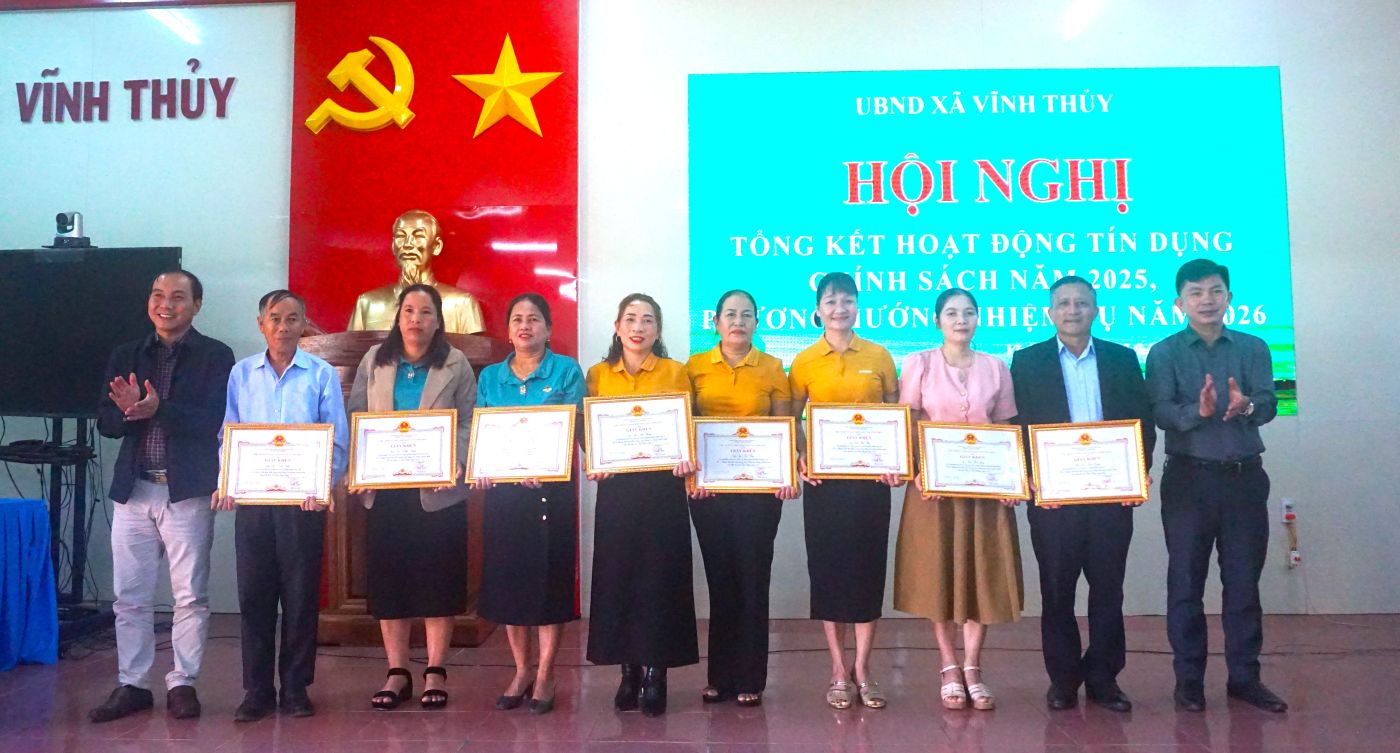 Nhân dịp này, UBND xã Vĩnh Thuỷ đã biểu dương, khen thưởng các tập thể, cá nhân có thành tích tiêu biểu trong công tác quản lý và thực hiện tín dụng chính sách xã hội năm 2025.