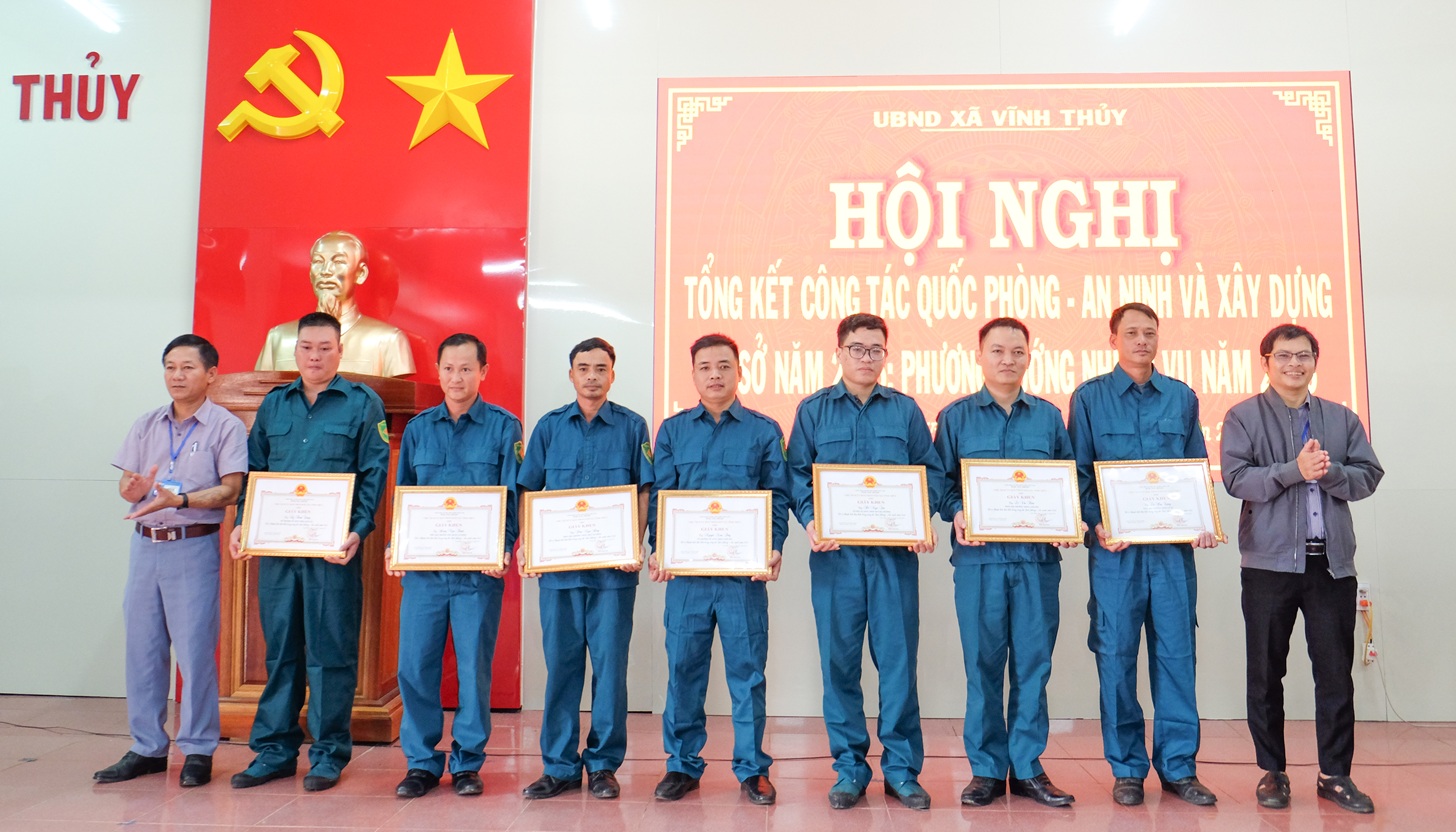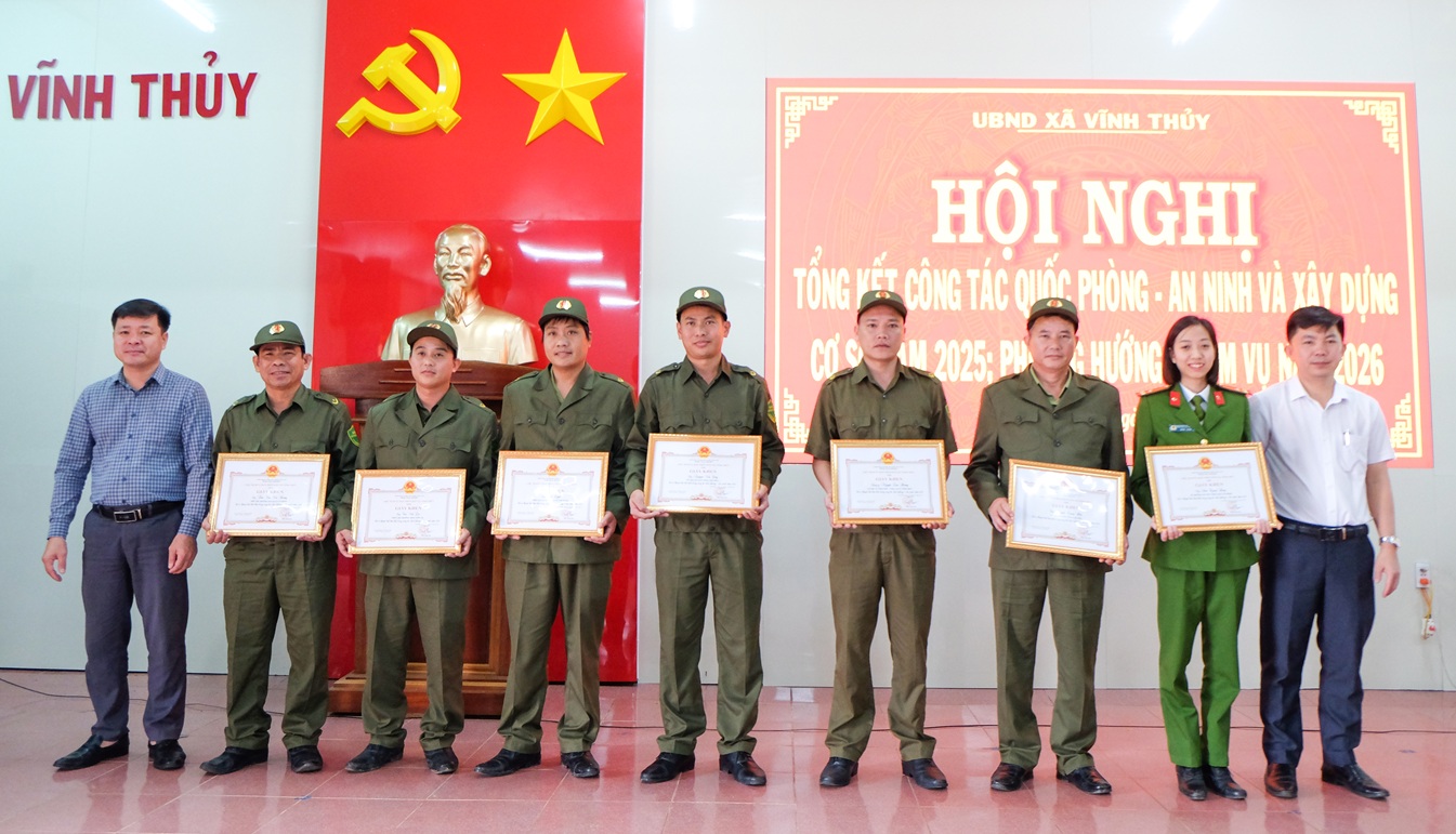 Nhân dịp này, UBND xã Vĩnh Thuỷ đã tuyên dương khen thưởng các tập thể cá nhân có thành tích xuất sắc trong công tác quốc phòng, an ninh và xây dựng cơ sở năm 2025.