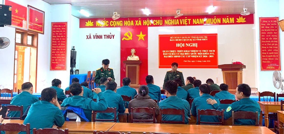 Thực hiện chỉ đạo của cấp trên về công tác bảo đảm an ninh, an toàn cho cuộc bầu cử đại biểu Quốc hội khóa XVI và đại biểu Hội đồng nhân dân các cấp nhiệm kỳ 2026 – 2031, sáng nay 11/3/2026, Ban Chỉ huy Quân sự xã Vĩnh Thuỷ đã tổ chức hội nghị quán triệt và triển khai nhiệm vụ trực sẵn sàng chiến đấu (SSCĐ) cho lực lượng dân quân trên địa bàn.
