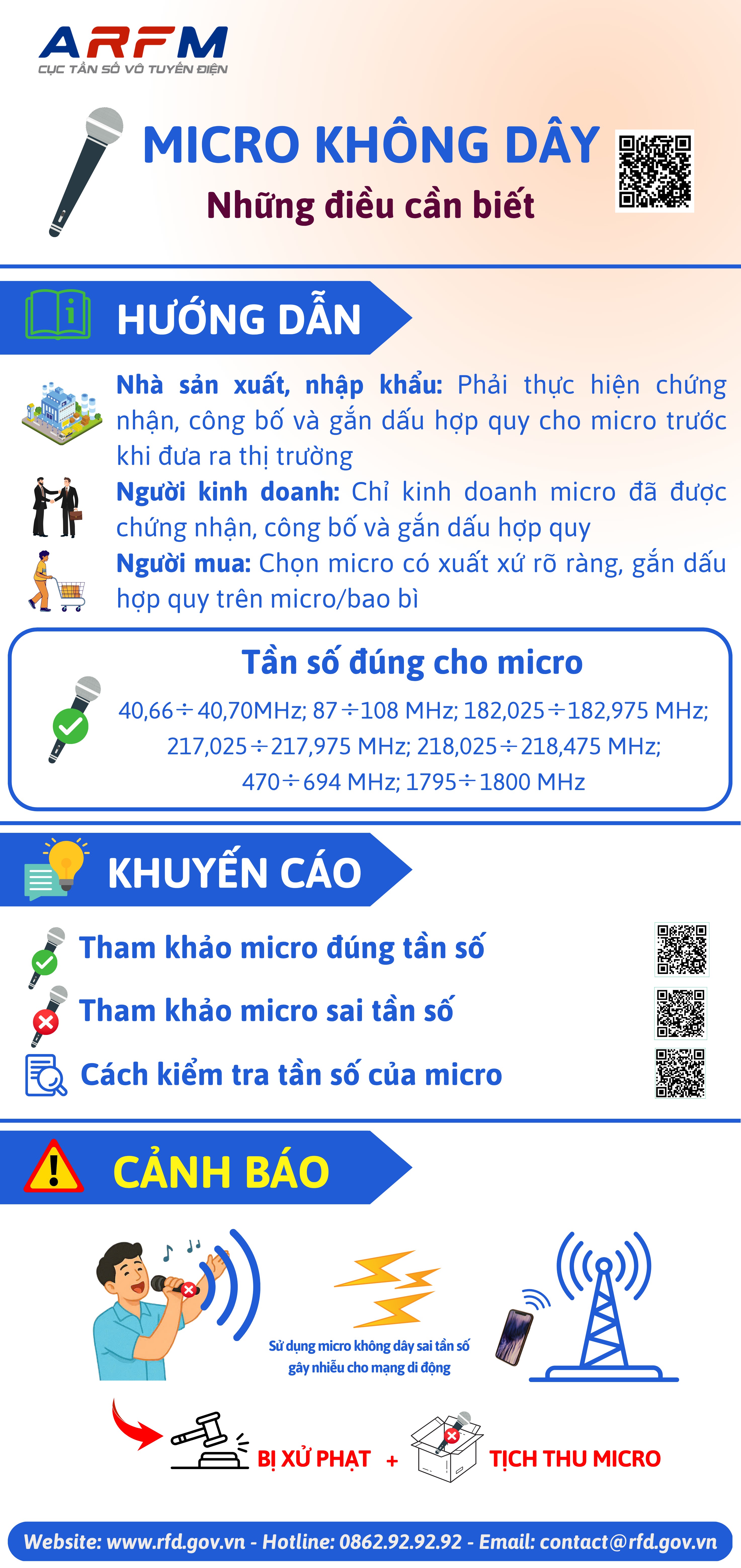 Nếu có thắc mắc về micro không dây có thể phản ánh qua email: contact@rfd.gov.vn hoặc gọi điện thoại đến số: 0862.92.92.92 của Cục Tần số vô tuyến điện – Bộ Khoa học và Công nghệ trong giờ hành chính để được giải đáp.